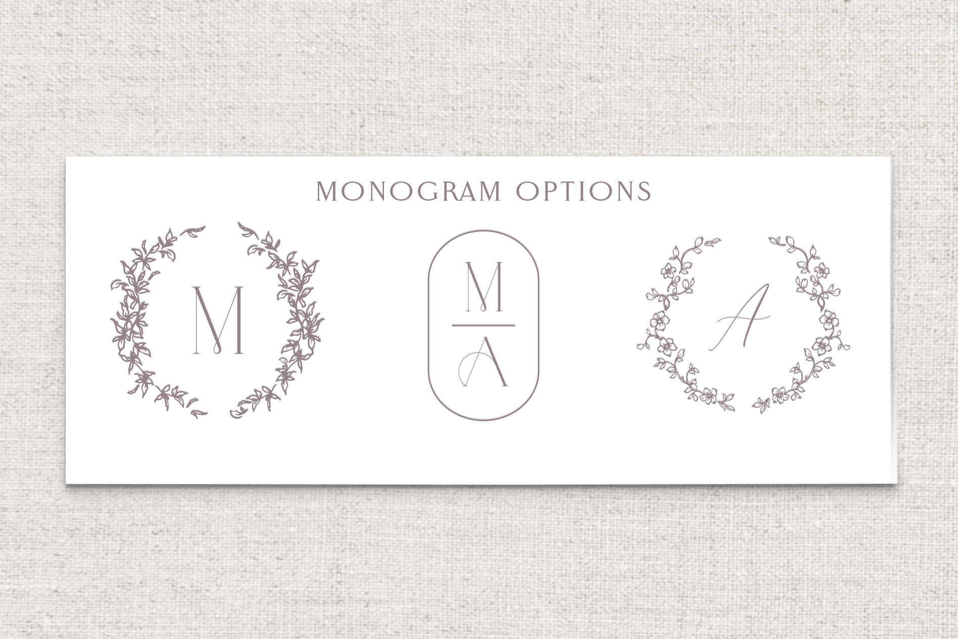 The monogram suite features customizable monograms in three illustration styles ranging from modern to floral. The delicate details of the monogram are carried through the rest of the suite, in subtle and elegant ways.